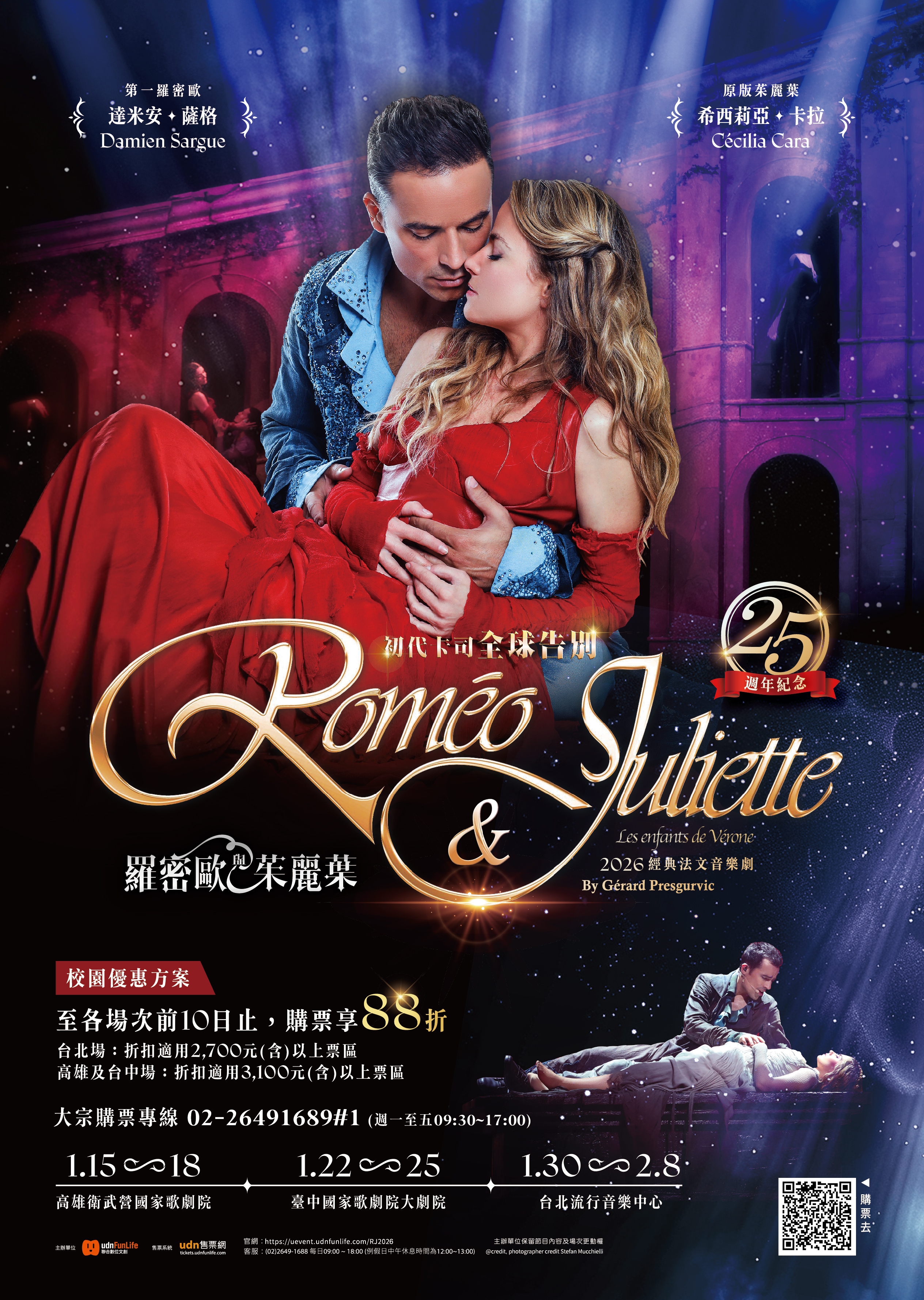 - 經典法文音樂劇《羅密歐與茱麗葉》自2001年在巴黎首演即轟動全球,以磅礴動人的音樂、現代感十足的編舞與都市巴洛克風格美學,重新詮釋莎士比亞經典悲劇,劇中更以紅與藍兩大色系象徵家族對峙,展現強烈視覺張力;而初代卡司的演出早已成為大眾心中難以取代的記憶,本次適逢音樂劇25周年同時也是初代卡司告別巡演,讓這次在台灣的演出更具紀念性。法文音樂劇以獨樹一格的「演唱會」形式製作打造,特別強調「音樂」與「演員魅力」,以「歌」帶「戲」是法式音樂劇製作的順序與模式,藉由歌曲詠唱以及雋永詞彙的表達,再加上多樣化背景音樂襯托,讓演員的情緒起伏及情感傳遞更加深刻。誠摯推薦師生前來觀賞國際級精彩演出,並藉此增進對各類表演類型的了解。